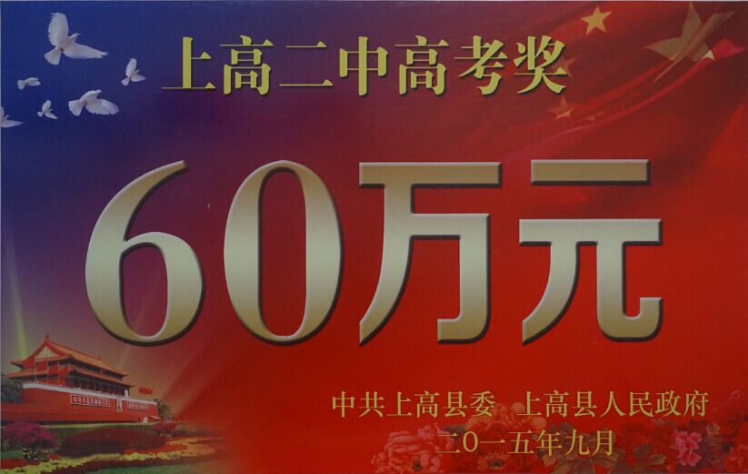 9月10日晚上,在上高县教育系统纪念抗战胜利70周年暨庆祝第31个教师节表彰晚会现场,上高二中获得县委县政府60万元高考奖励。